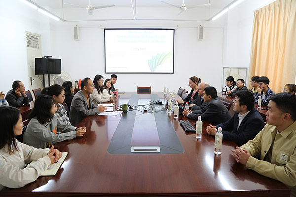 张佩成向Tony Bacic院士一行简要介绍了学院建设发展情况,并希望各位客人经常来园艺学院交流、指导。随后,Tony Bacic院士作了题为“Designer Walls: Non-Cellulosic Polysaccharide Synthesis in Plant Cell Walls”的学术报告,报告介绍了植物细胞壁的几大热点研究领域,并结合La Trobe大学开展的研究项目介绍了细胞壁合成的生理机制,FLAs蛋白,以及胁迫条件影响植物形态中的细胞壁响应机制。精彩的报告引起了与会师生的浓厚兴趣,并就相关问题与Tony Bacic院士进行了热烈的讨论和交流。Tony Bacic院士参观了校区和相关实验室,还对省风景园林学一流学科、专业建设提出一些建设性意见和建议。