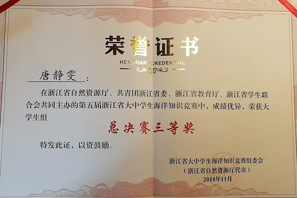 11月23日-24日,由浙江省海洋与渔业局、共青团浙江省委、浙江省教育厅、浙江省学生联合会主办的浙江省大中学生海洋知识竞赛在杭州举行。经过激烈角逐,由我院章陈超、李勇老师指导的产品设计182唐静雯荣获三等奖,学院荣获活动组织奖,这是我院在此项赛事中取得历史最好成绩。