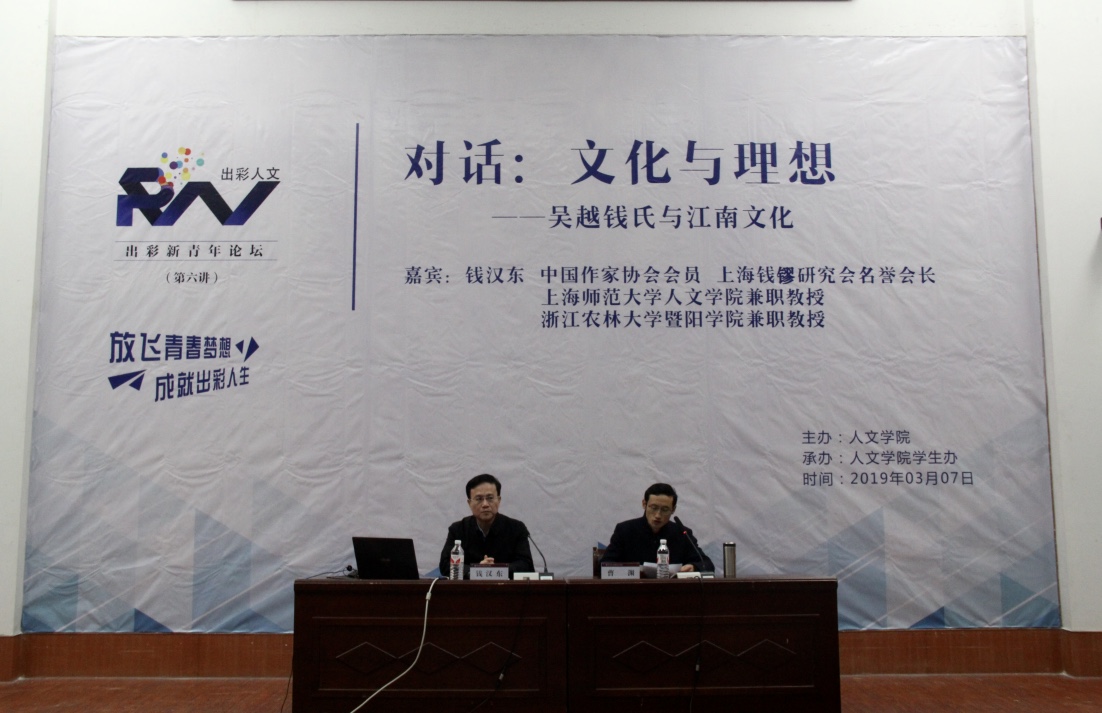 历史涌流,吴越江南涵韵古今;心潮澎湃,暨阳诸暨引领出彩。2019年3月7日下午两点,中国作家协会会员、上海钱鏐研究会名誉会长、上海师范大学人文学院兼职教授、3044am永利集团3044noc兼职教授钱汉东作客论坛,畅谈传统文化与家国命运的联系。3044am永利集团3044noc党委副书记高国俊,人文学院院长刘伯茹、学生办主任、全院师生代表200余人出席此次论坛,活动由人文学院党总支书记曹渊主持。