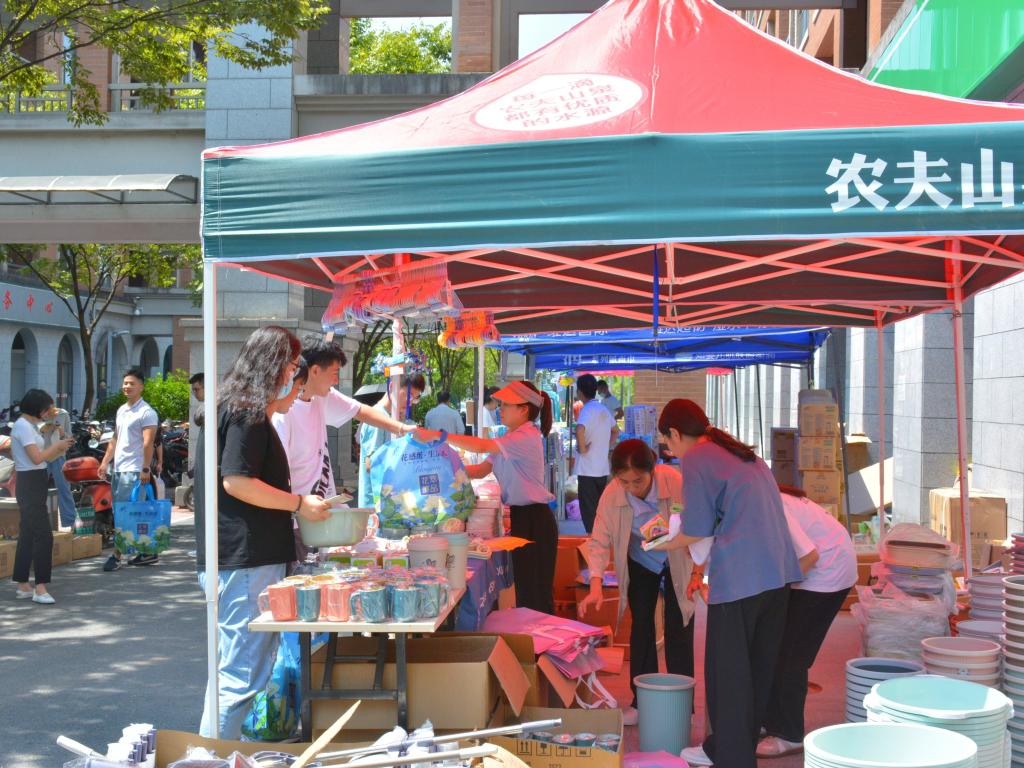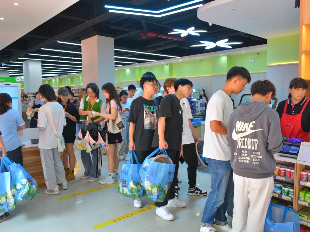 “超”多商品,满足购物需求。超市为迎接新生提早准备、精细布置,内部设有新生专区,外部设置新生卖场,既分散了购买人流,保障了购物秩序,又满足了新生的购买需求。同时,为了减少新生人员聚集以及缩短队伍长度,安排专人在自助结算机旁进行引导工作。