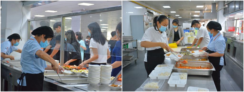 “食”暖人心,做好就餐保障。诸暨服务部利用暑期对大众食堂、美食广场进行整体改造,增加了用餐档口和就餐座位,并提前组织相关人员做好油烟管道清洗、卫生及设施设备清洁,为师生营造一个安全、健康、舒适的饮食环境。迎新当日凌晨4点半,食堂员工早早完成原材料验收后,热火朝天地投入到洗切剁擀、蒸煮煎炒工作,及时为学生们送上可口的饭菜。同时,通过增加菜品数量、延长营业时间等方式,满足不同时间段的就餐需求。食堂还为迎新工作人员以及志愿者提供了1500余份色味俱佳的工作餐。