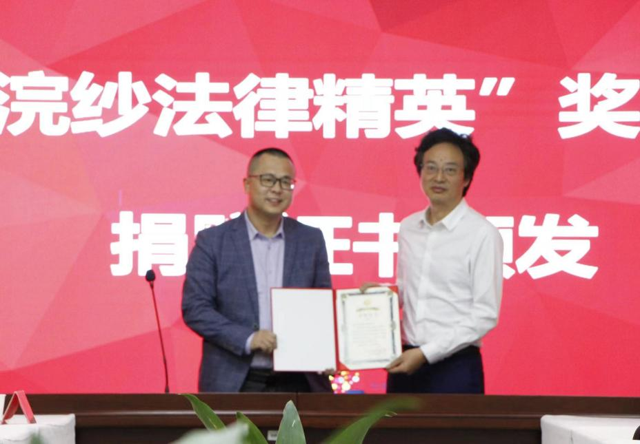 王钟为陈胜利颁发“浣纱法律精英”捐赠证书。