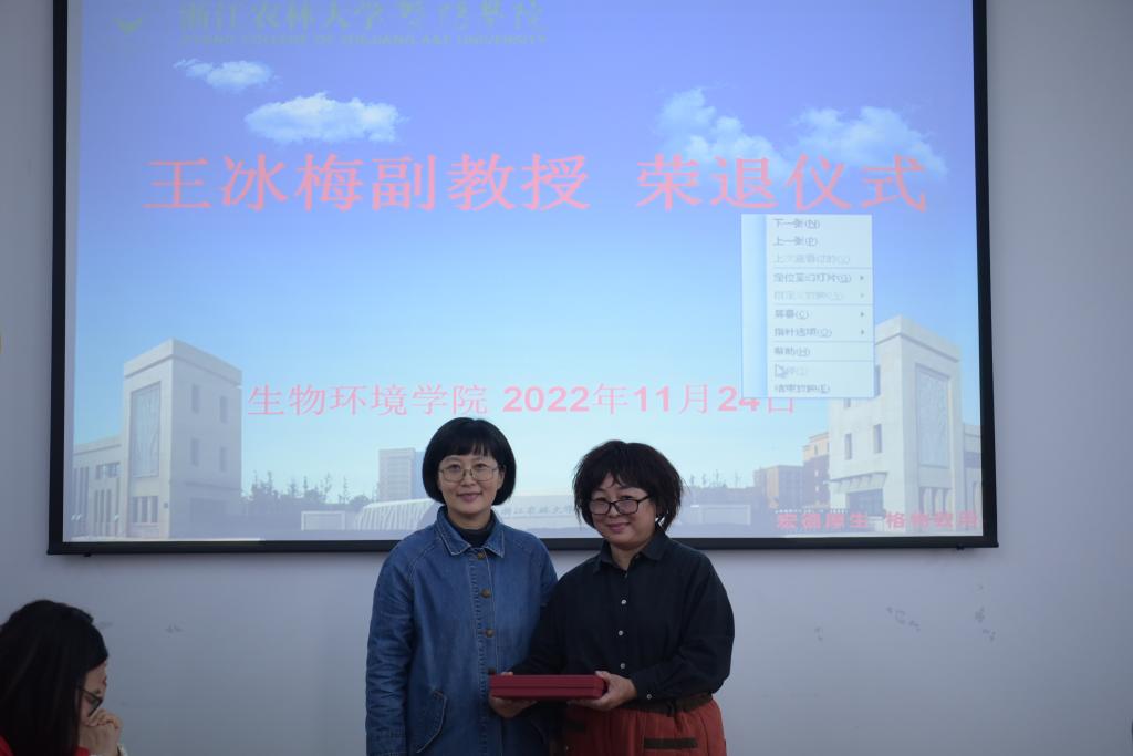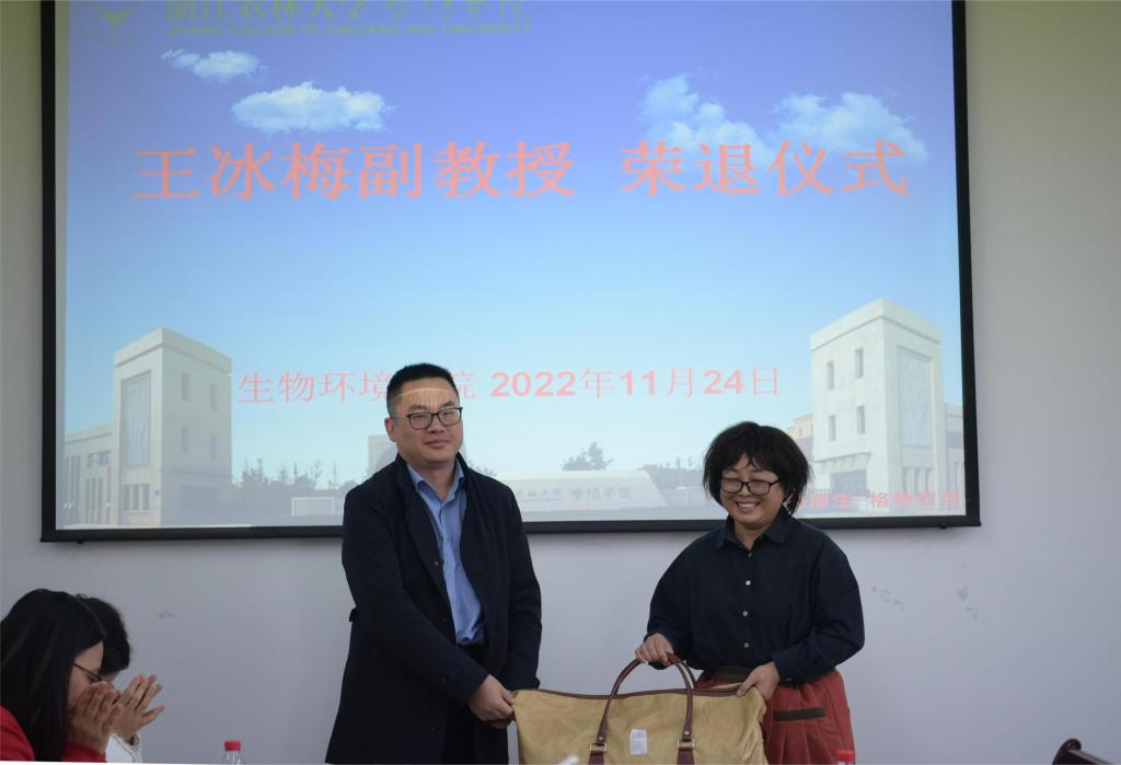 徐润生代表生物环境学院领导班子对王冰梅多年来为中药专业所作的贡献表示了感谢,并希望王冰梅老师在退休后继续为学院青年教师培养和学院发展建言献策。