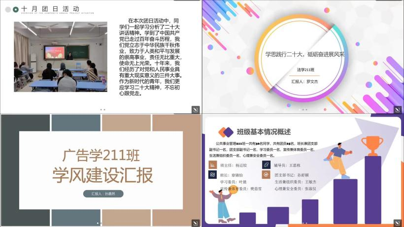 比赛中,每班限时3-5分钟,围绕班级基础情况、学风建设、素质拓展、未来计划等内容展开,以PPT、小视频等形式进行班级创建汇报。在所有班级风采展示完毕后,彭杨贺对各班汇报进行点评,并对班级建设提出四点建议:一是班级要树立共同的核心价值观,心往一处想,劲往一处使,班级凝聚力才能得到充分体现。二是班委、学生干部要加强自身管理能力,认真学习“枫桥经验”的治理模式,将学习心得运用到班级日常的管理。三是营造比学赶超的学风氛围,鼓励同学们互帮互助,向优秀的同学看齐。四是优化班级沟通机制,班委要与班主任、辅导员、班级同学保持定期沟通,将沟通反馈机制落实落细。最后,彭杨贺希望各班借此机会,相互学习借鉴,共同促进班级建设。