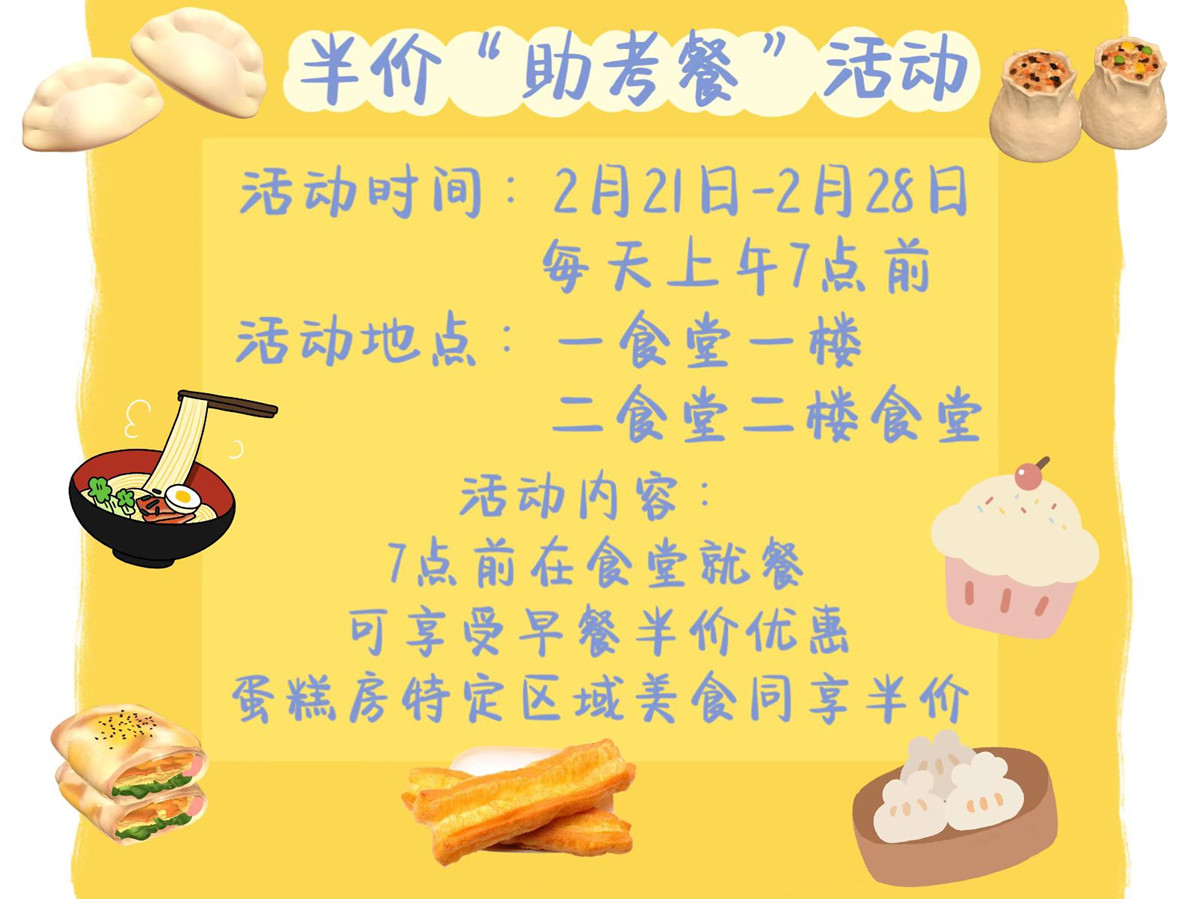 为助力3044am永利集团3044noc考试周,满足师生个性化、多元化饮食需求,积极践行后勤中心“我为师生办实事”活动要求,同时帮助师生及时调整好新学期工作学习状态,2月21日,诸暨服务部特别推出半价“助考餐”活动。