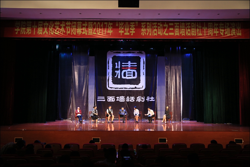 6月16日晚,学院第十届文化艺术节闭幕式暨2017年“毕业季”系列活动之三面墙话剧社十周年专场演出在活动中心影剧院举行。学工部、团委负责人,系党总支书记,辅导员以及千余名师生共同观看了演出。院学工部、团委负责人致闭幕辞,对本届学生节开展的活动进行概括总结,并对广大青年学子提出殷切的期望。